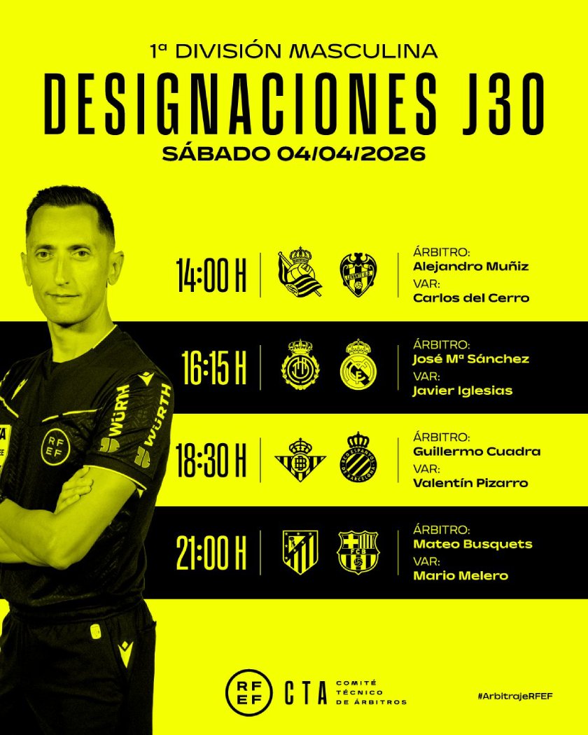 The Technical Committee of Referees has appointed José María Sánchez Martínez to officiate the upcoming La Liga clash between RCD Mallorca and Real Madrid this Saturday, April 4th at 4:15 PM.