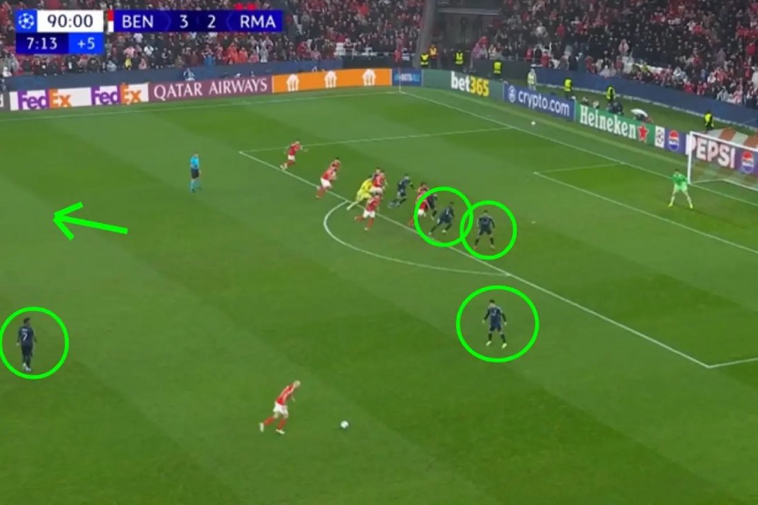 With Real Madrid down to nine men, the margin for error was minimal. And yet, in one decisive action, the team completely lost its structure. Despite being numerically inferior, several players failed to retreat and defend with urgency. The result was as striking as it was revealing: eight Benfica players attacking against just five Real Madrid players positioned to defend inside Courtois’ area.