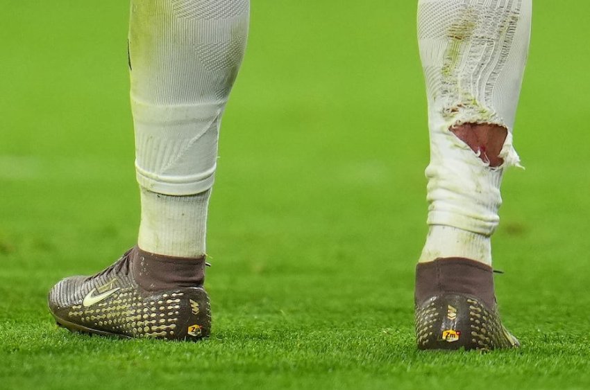 The German defender attempted to stop Mbappé’s run down the right flank with a forceful challenge. While it appeared he aimed to bring him down with his upper body, his boot made contact with the striker’s leg, tearing both his sock and stocking. The visible damage highlighted the intensity of the tackle, which ultimately resulted in only a yellow card.